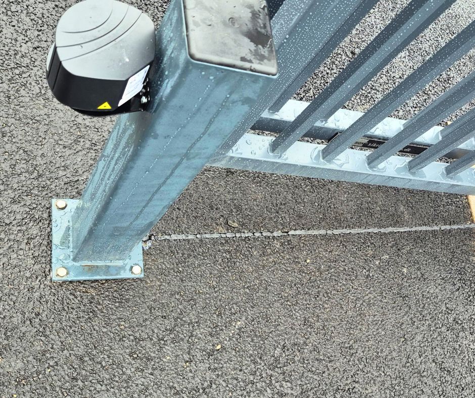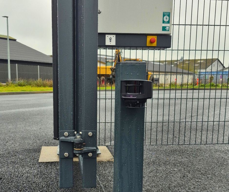 Porten er udført som en foldeport, hvilket giver en pladsbesparende og hurtig åbning. Radaren registrerer køretøjer og aktiverer porten, så brugeren kan passere uden manuel betjening. Løsningen er kombineret med panelhegn, som skaber en tydelig og robust afgrænsning af området.