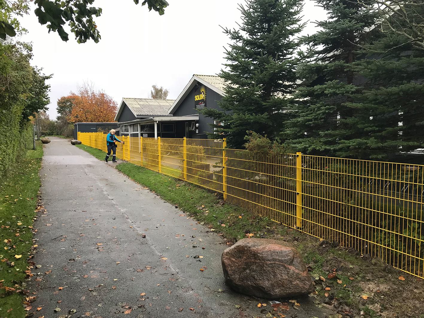 Hos Børnehaven Solen i Aarhus lagde vi ud med at fjerne et ældre maskinflet hegn samt de gamle porte og låger. Vi valgte sammen med Solen at opsætte et nyt hegn i en flot solgul farve ved indgangspartiet. Resten af hegnet blev valgt i en nedtonet flot antracit grå farve, som matcher bygningerne.
