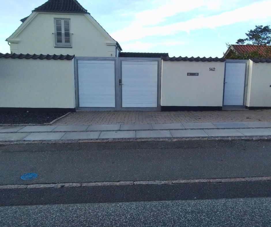 Her har vi opsat en hvid komposit, som matcher flot til både bygninger og den mur, der fungerer som et værn mod vejen. Vores smed har målt op, produceret og monteret en låge og port, som passer præcist på mål og nu indgår som en integreret del af muren.