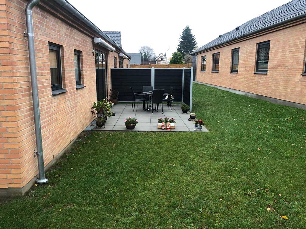 Ved et nybyggeri i Ringe området er komposithegnet valgt, fordi det skaber lidt fred i et ellers åbent område, men også fordi hegnet skulle matche døre og vinduer i bygningerne.