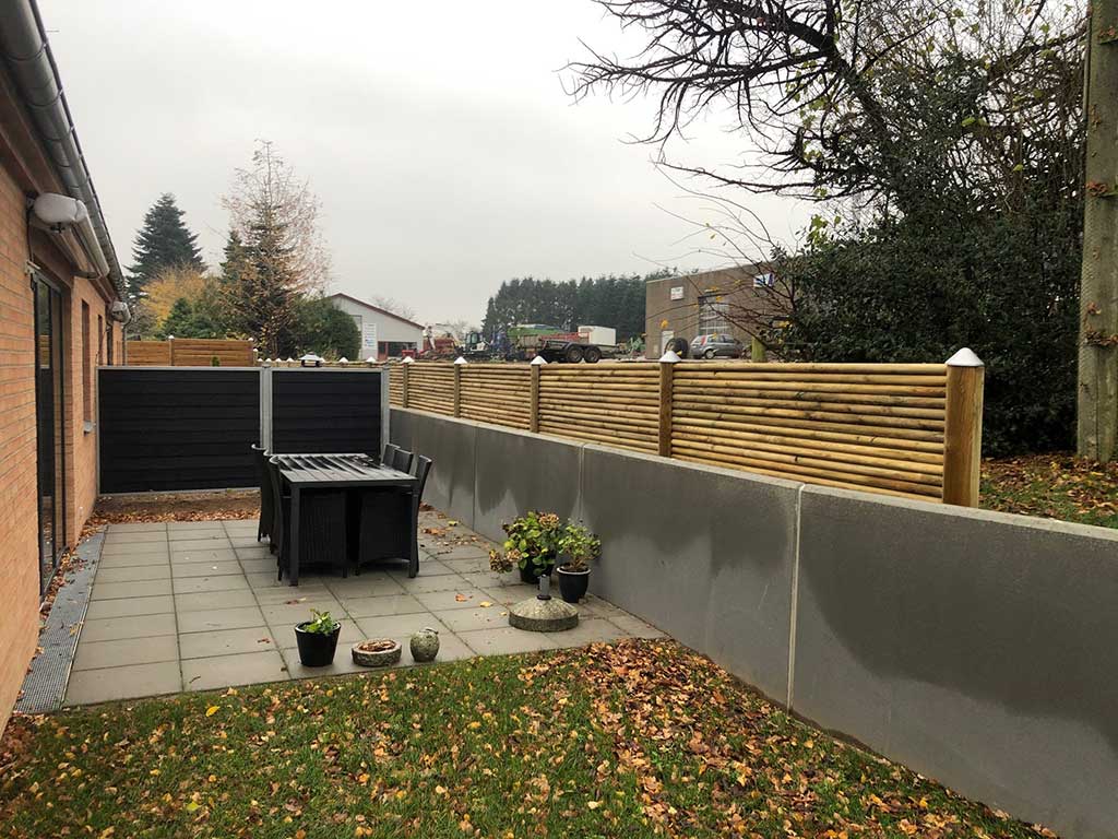Komposithegn fås med og uden støjdæmpning. Til denne type byggeri indhegning giver det ikke mening at anvende komposithegn med støjdæmpning, da formålet er at skærme af for at opnå ro, fred og læ på terrassen.
