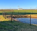 Hegnet er lavt, naturligvis, da formålet med hegnet er indfriet - blot ved at vandhullet nu er hegnet efter virksomhedens ønske. Vi har monteret en matchende, mindre adgangslåge, for der vil jo opstå et behov ind i mellem for at kunne komme til vandhullet.