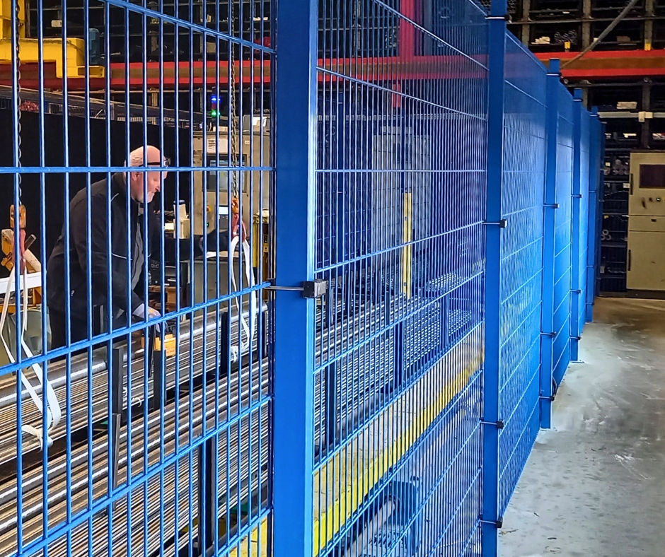 Valget faldt på blå panelhegn med kraftig trådtykkelse og høj opbygning – ideelt til indendørs maskinafskærmning, hvor kravene til robusthed og stabilitet er høje. Farven bidrager med øget synlighed og matcher samtidig virksomhedens visuelle identitet, hvilket skaber sammenhæng og professionalisme i rummet.