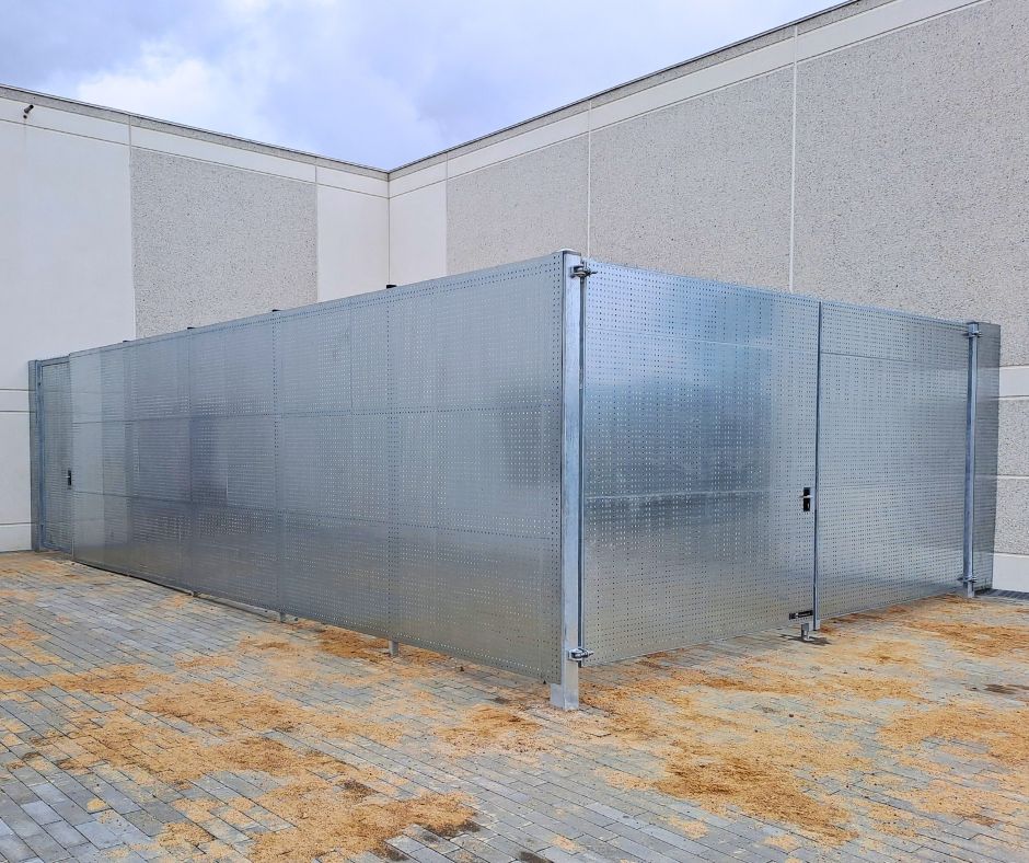Fordi et pladehegn er et slags systemhegn, som sammensættes af galvaniserede plader, kan det justeres efter behov i både højde og bredde. Her hos Ilva er højden blevet ca. 2,5 mtr., og ingen kan se, hvad der gemmer sig bag, medmindre man kommer helt hen og kigger igennem de 2 mm. små huller.