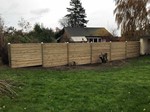 Det særlige ved denne løsning er grundens udformning. Hus og have er nærmest bygget hen over en gryde, og det giver naturligvis nogle udfordringer, når vi skal lave en vandret top. Hegnet her dybest på midten, så vi har ”tannet” fra begge sider.