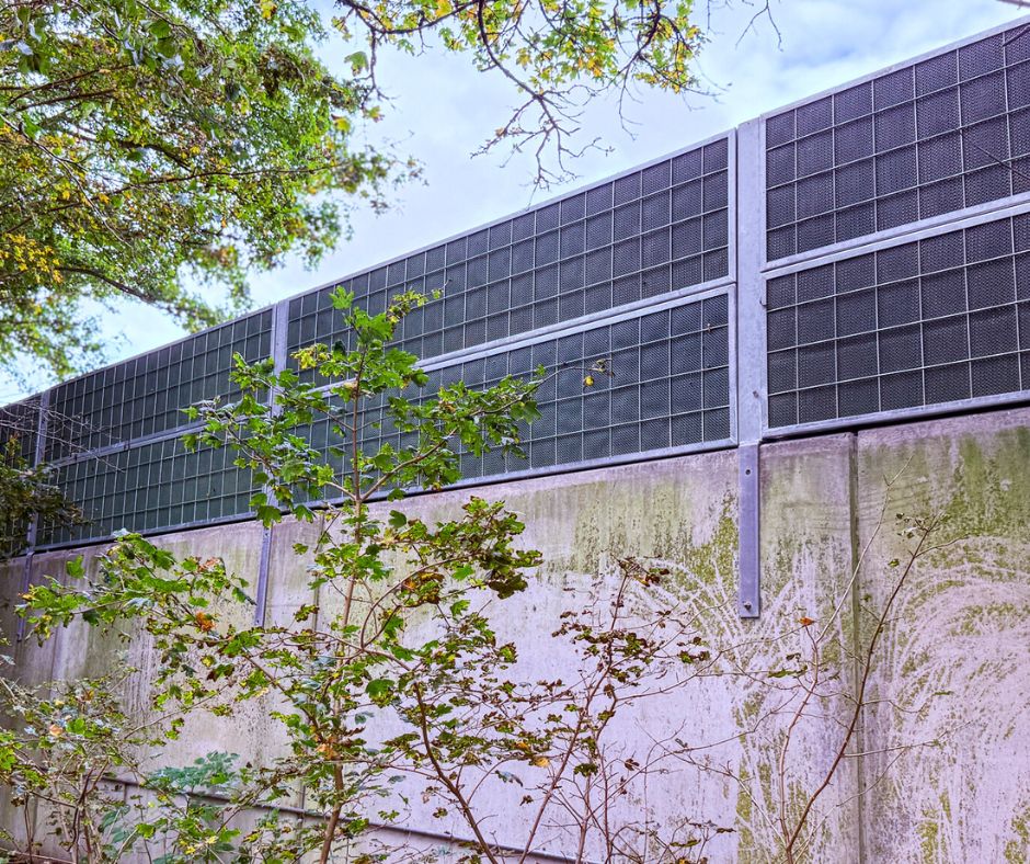 Vores støjhegnsløsninger som denne findes i mange forskellige varianter – og også med træbeklædning i forskellige farver.
